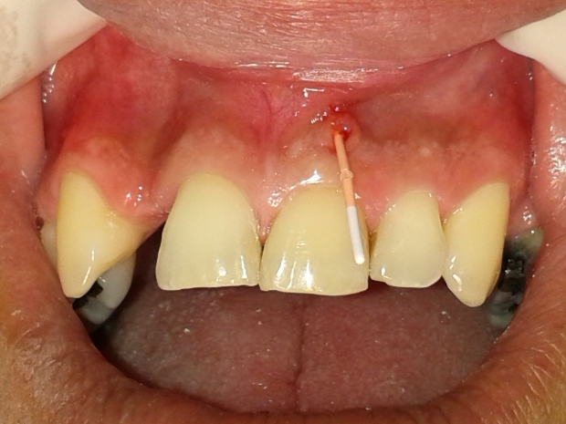 O mesmo relatava histórico de trauma dental na infância, sendo que previamente foi submetido a uma intervenção de urgência no elemento 21 por outro profissional, visto que se apresentava com edema e dor na região apical. Pela presença de fístula nesta região, foi realizado rastreamento na mesma, sendo a mesma oriunda do elemento dental 21 (figuras 2 e 3).