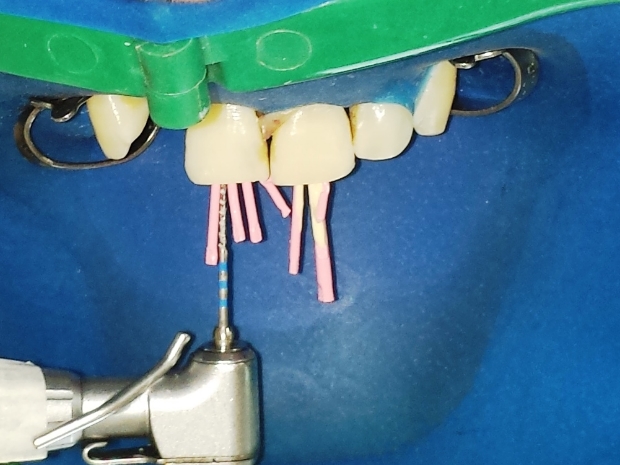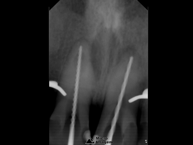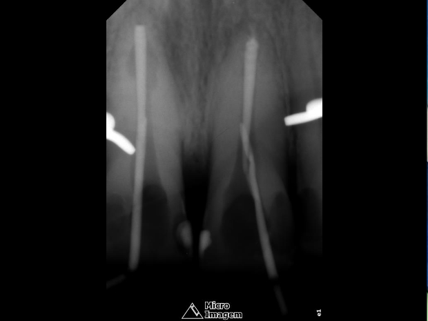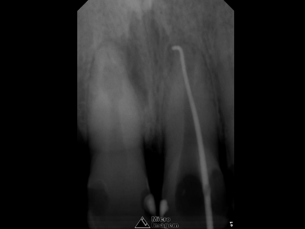 Após a abordagem inicial do paciente, o mesmo foi anestesiado e procedeu-se à confecção do isolamento absoluto. Posteriormente, o acesso coronário foi realizado, onde se constatou clinicamente a necrose pulpar de ambos os dentes. Foi realizada uma penetração desinfetante crown-down empregando como agente irrigador NaOCl a 5%, sendo a odontometria realizada pelo método radiográfico, devido a inviabilidade de emprego de um localizador foraminal nestas condições anatômicas, podendo influenciar em sua precisão (figura 4).