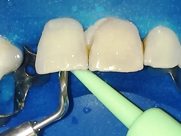 O preparo foi realizado pela técnica de preparo biescalonado (step-back) utilizando Limas K (Maillefer/Suiça) e como agente irrigador NaOCl 2,5%, procurando dilatar toda a conformação do canal radicular. A cada troca de instrumento, realizou-se irrigação ultrassônica com insertos lisos (Irrisonic/Helse/Brasil) por meio do conceito PUI e CUI (figura 5). Como complemento ao processo de descontaminação intracanal, foram realizados duas trocas quinzenais de Hidróxido de Cálcio (Ultracal/Ultradent/USA), objetivando também a analise da qualidade de limpeza obtida na área da reabsorção pela radiopacidade deste medicamento (figura 6).