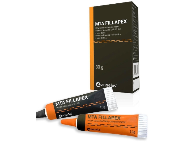 A obturação foi realizada pela técnica termomecânica Híbrida de Tagger (figuras 7 e 8) por meio do emprego de GutaCondensor (Maillefer/Suiça), cones de guta-percha TP (Dentsply/Brasil) e cimento obturador à base de M.T.A. Fillapex (Angelus/Brasil) (figura 9).