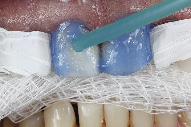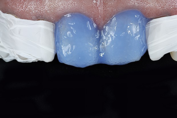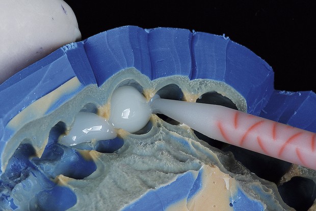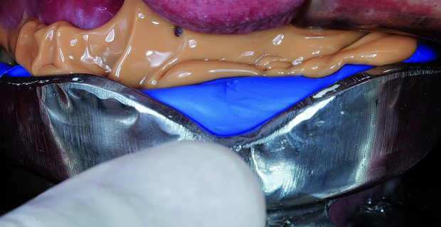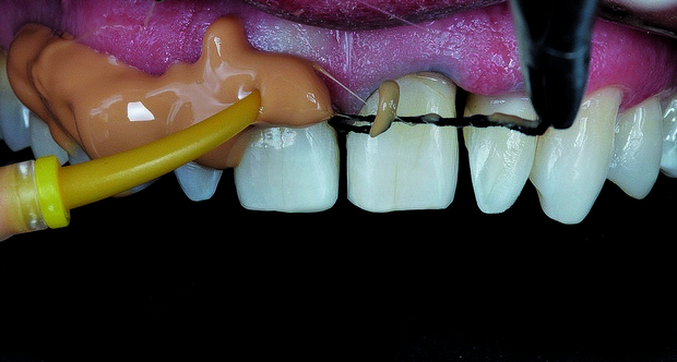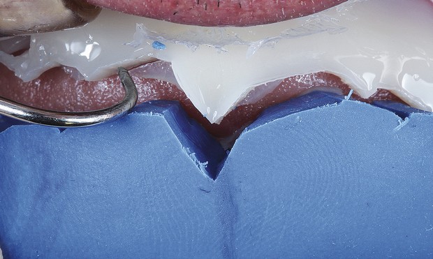 As imagens 18a, b, c e d apresentam o procedimento de moldagem com uma silicona de adição em etapa única. O material leve é injetado assim que o fio Pro-Retract 0000 é removido com o uso de uma pinça (figura 18a). O material leve, depois de injetado em todas as cervicais dentais, é aplicado um jato de ar para impelir o material contra os dentes (figura 18b); logo a seguir, é levada a moldeira em posição com o material pesado (Putty) (figura 18c). A vista final da moldagem, na qual se pode ver nitidamente que o material leve copiou adequadamente a região cervical dos dentes pode ser apreciada na figura 18d.