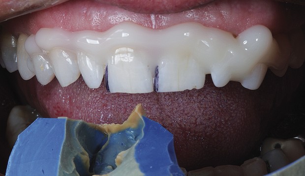 A figura 24 exibe a prova (Try-In) dos cinco laminados em posição. Concluiu-se que a melhor cor foi o A3, devido à saturação do canino natural (esquerdo). Esta é a situação clínica mais crítica, quando se faz um número parcial de laminados, e estes devem mimetizar os dentes remanescentes.