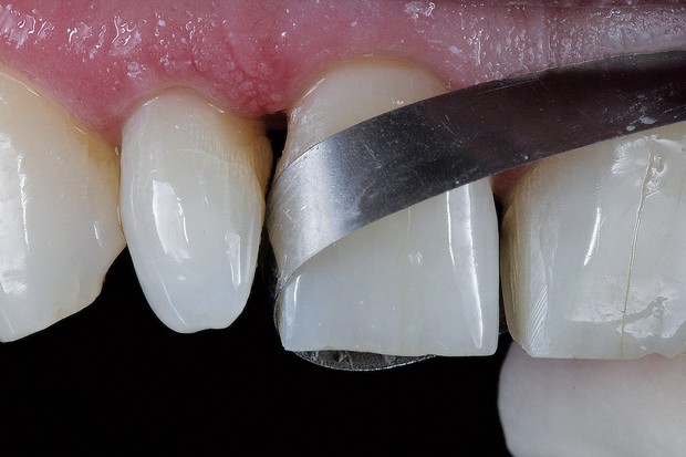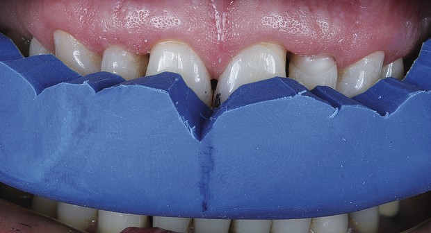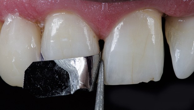 A figura 15 apresenta a vista da guia de preparo no incisivo central superior direito, evidenciando a não necessidade de redução vestibular. É importante que se limite o preparo ao esmalte.