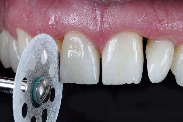 Os recursos utilizados para o desgaste proximal do esmalte são apresentados no grupo de imagens 12, desde um preparo com ponta diamantada cônica longa (12a), ou um disco diamantado, que permite um desgaste mais fino (b), ou até o uso de lixa de aço diamantada para um desgaste mais delicado (c).