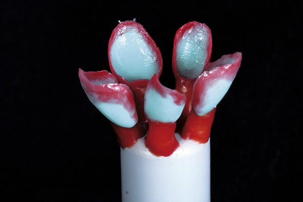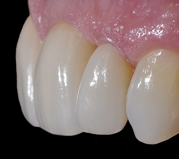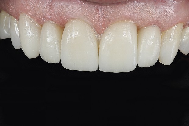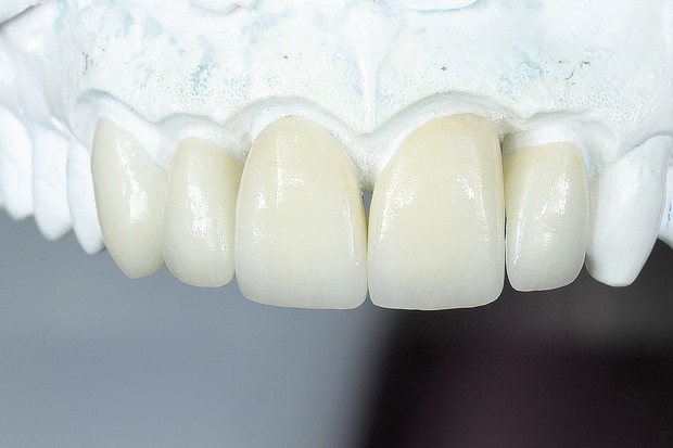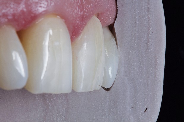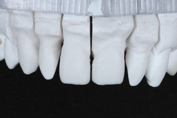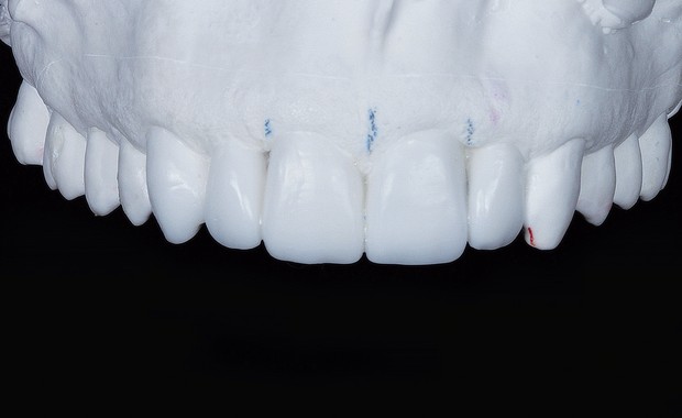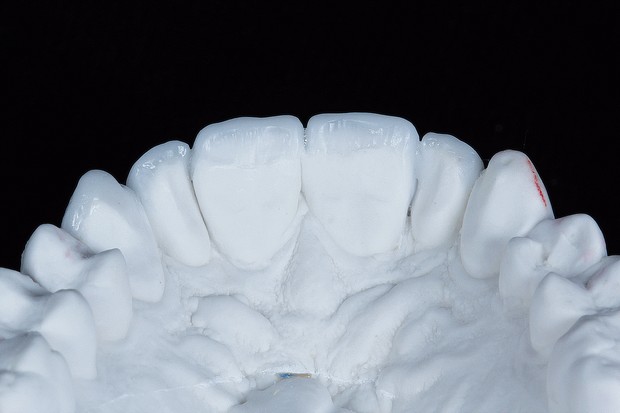 Sobre o modelo de gesso foi feito o enceramento As imagens 8a, b e c demostram a tomada frontal, a vista oclusal do enceramento – mostrando o alinhamento vestibular alcançado com o mínimo de desgaste – e a vista palatina, mostrando o recontorno incisal, respectivamente.
