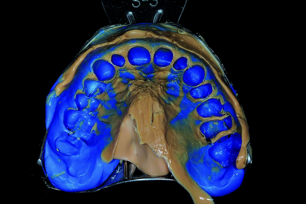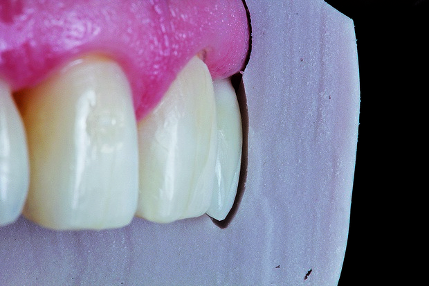 A partir do modelo de gesso encerado, foi feita uma matriz (Mock Up) com silicona de adição, com o recorte a 1mm acima do limite gengival com o intuito que a própria adaptação da silicona com a gengiva permita o corte do material de ensaio restaurador em excesso, conforme demonstrado na figura 10.