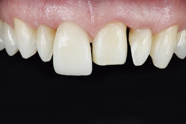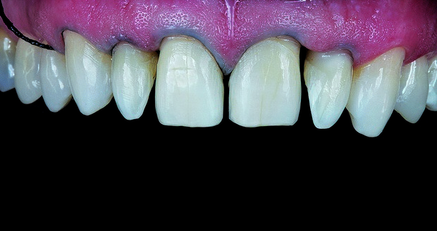 As primeiras imagens mostram a vista geral do sorriso do paciente dentro do protocolo de fotografia de sorriso: fotografia frontal; meio perfil direito e esquerdo. A figura 1ª apresenta a tomada frontal, evidenciando uma desarmonia do sorriso, com os pontos de contato mesiais dos incisivos centrais superiores fora da linha sagital mediana, o incisivo lateral superior esquerdo girovertido e com diastema mesial, bem como o bordo incisal do canino superior direito mais alto que o canino esquerdo. A figura 1b mostra a tomada do lado direito evidenciando a dimensão mésio-distal limitada do incisivo lateral. A imagem 1c apresenta a tomada do lado esquerdo, evidenciando também uma dimensão mésio-distal limitada do incisivo lateral, mas com um agravante, que é a falta de papila entre o incisivo central e o lateral.