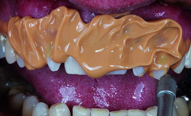 A figura 31 apresenta a aplicação do cimento resinoso para laminados Allcem Veneer A3 em abundância nos laminados dos incisivos centrais, com o intuito de ao assentar as lâminas, evitar porosidades.