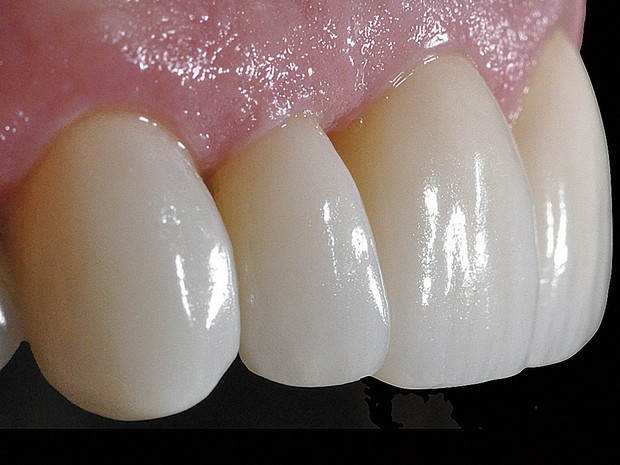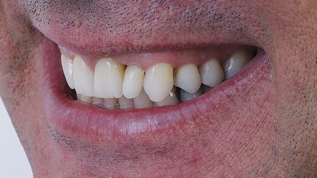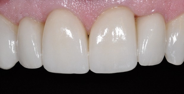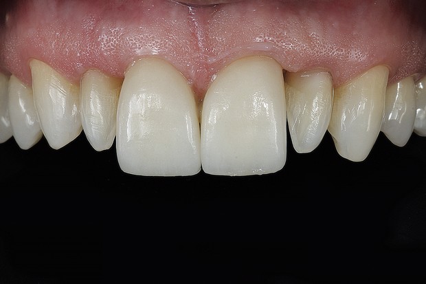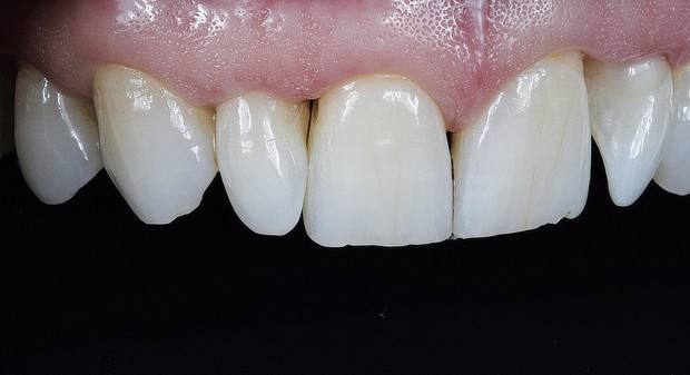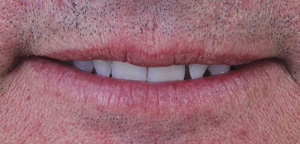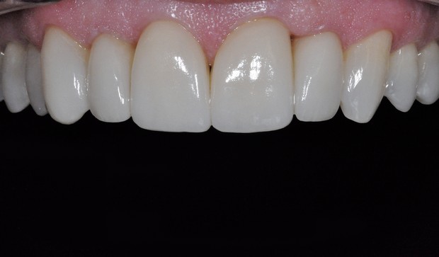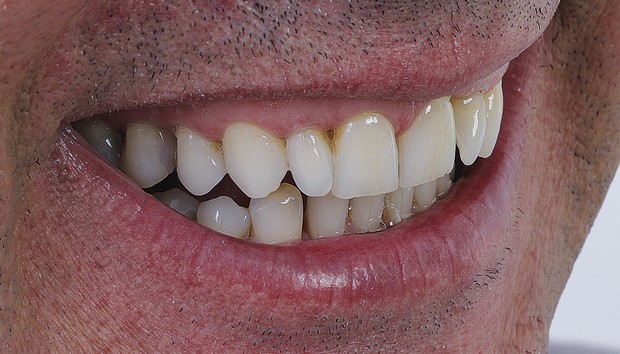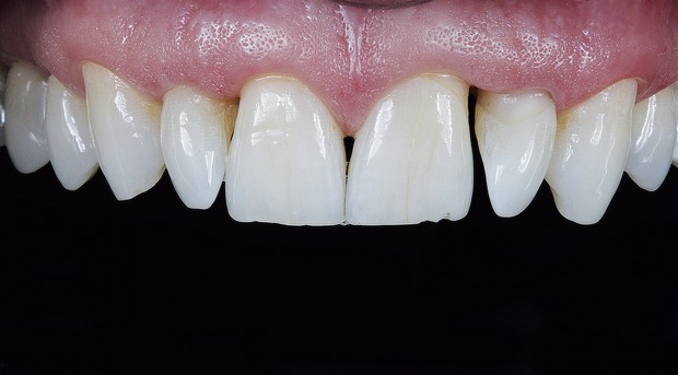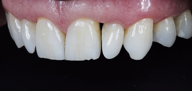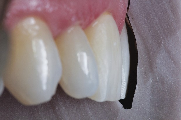 As imagens 3a, b e c revelam as vistas do meio perfil direito, frontal e esquerdo, respectivamente, evidenciando uma saúde periodontal adequada, embora tenha uma perda de papila interdental entre incisivo central e lateral esquerdos, com significativa retração gengival nesta região, o que difere significativamente do lado direito, aumentando assim a complexidade do caso clínico. É importante salientar a uniformidade de cor e a integridade do esmalte dos dentes anteriores. O paciente utilizou o peróxido de carbamida a 10% (Whiteness Perfect 10%) com moldeiras. A uniformidade de cor dos dentes anteriores é fundamental para a técnica de facetas tipo “lente de contato”, devido a pouca espessura das lâminas, fato este que impede o uso de uma cerâmica mais opaca como base para corrigir cores mais saturadas ou mesmo de menor valor de um ou mais dentes.