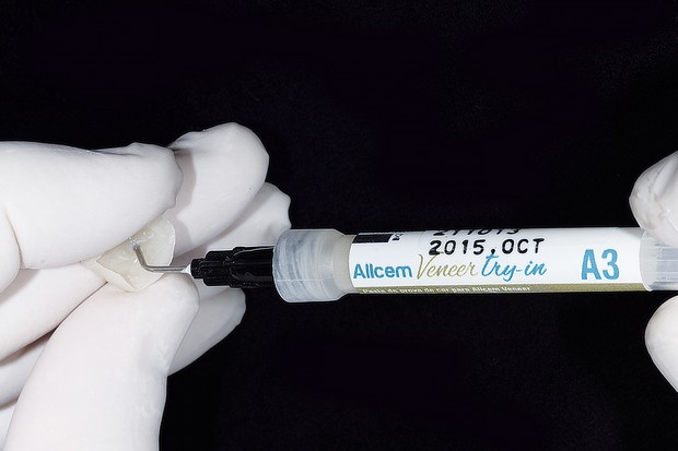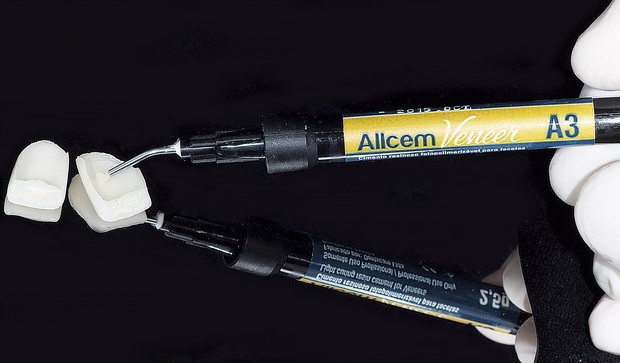 As pastas Allcem Try-In mimetizam a cor do cimento Allcem Veneer correspondente polimerizado, o que é importante para o sucesso do caso clínico, pois há uma mudança de tonalidade de todos os cimentos resinosos quando polimerizam (figura 26). As pastas Allcem Try-In são de fácil remoção e hidrossolúveis (laváveis)