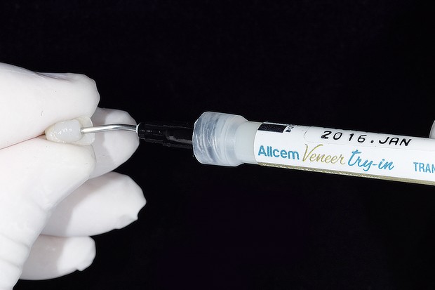 Para a escolha da cor do cimento resinoso Allcem Veneer, utiliza-se a pasta Try-In injetada na face de cimentação do laminado (figura 22a), para então assentá-lo em boca para o teste (figura 22b).