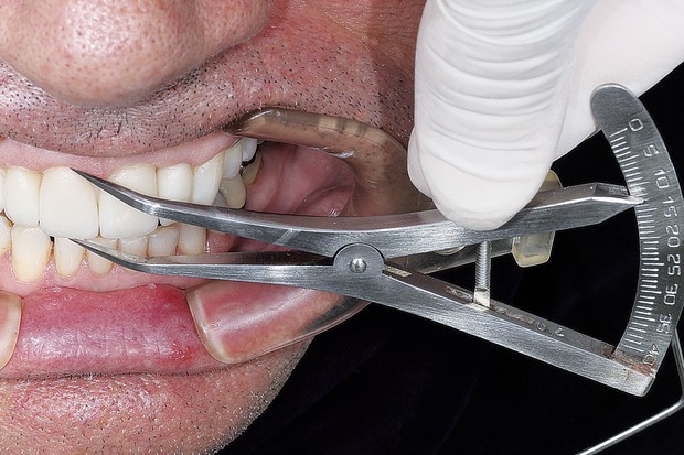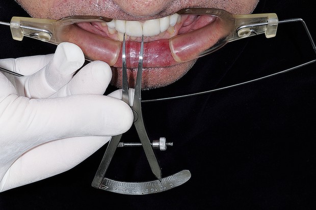 As figuras 25 a e 25 b apresentam a tomada das medidas mésio-distal e inciso-cervical do incisivo central direito, de forma a checar as dimensões intradentais, já verificadas na figura 6. As imagens seguintes, 25c e 25 d, mostram a verificação da similaridade das dimensões interdentais dos incisivos centrais entre si, de forma a harmonizar o aspecto dominante dos mesmos no sorriso.