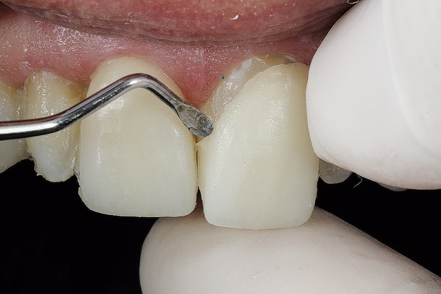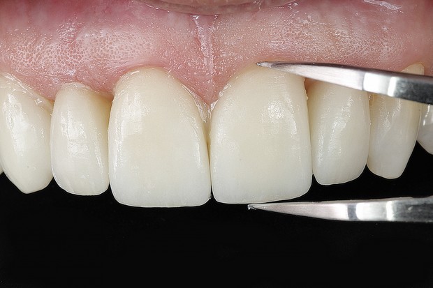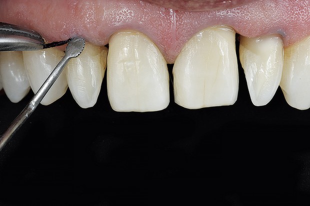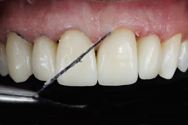 Após a fotoativação, se algum excesso de cimento persistir, pode ser removido com uma lâmina 12 de bisturi (figura 38a). A seguir, conforme mostra a figura 38b, o fio retrator Pro-Retract 0000 será removido, garantindo os sulcos gengivais livres de excessos de cimento resinoso. Um polimento cervical deverá ser feito para remover qualquer excesso que, porventura, possa ter permanecido (figura 38c).
