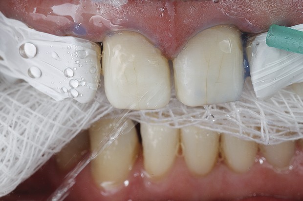A vista do laminado do incisivo central direito livre dos excessos de cimento resinoso Allcem Veneer e superfície do incisivo central esquerdo já com o sistema adesivo Ambar aplicado, ambos não fotopolimerizados são apresentadas na figura 34.