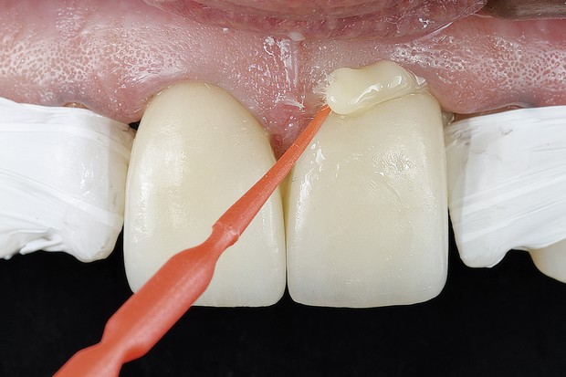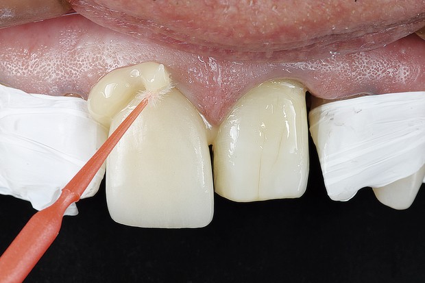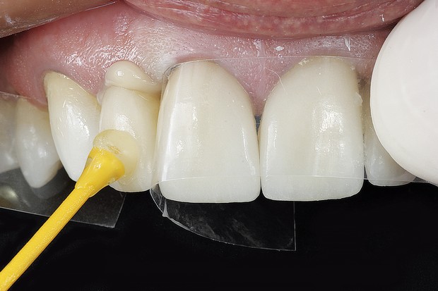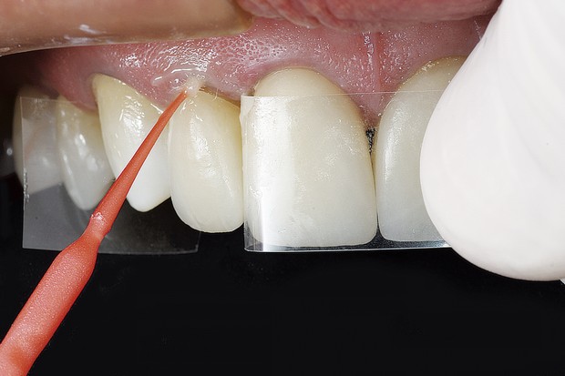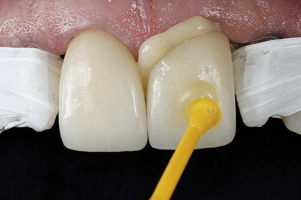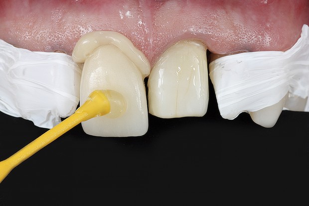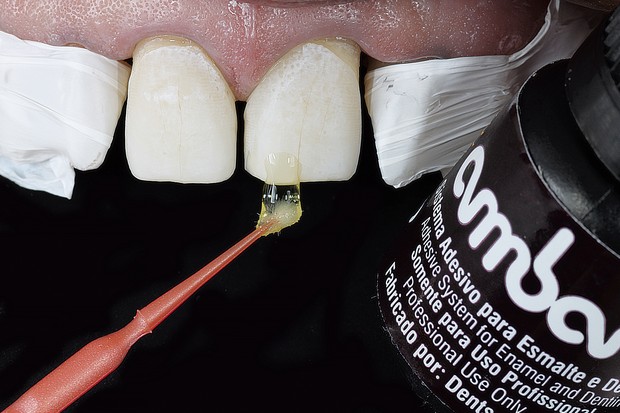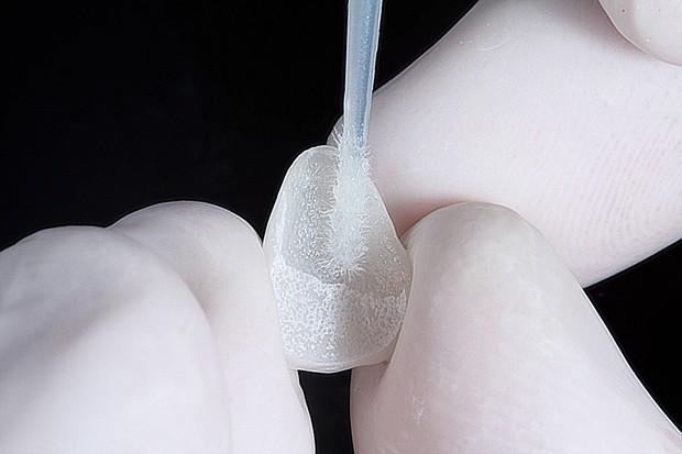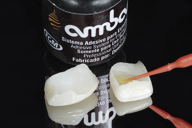 Para o preparo da cerâmica, no caso um vidro ceramizado reforçado por dissilicato de lítio (IPS e.max Lithium Disilicate, Ivoclar Vivadent), deve-se condicionar com ácido fluorídrico por 20 segundos (Condac Porcelana), conforme indicado na figura 30a; lavado e seco; aplicado o silano (Prosil), esperado um minuto (figura 30b); seco; opcionalmente aplicado o sistema adesivo (Ambar) (figura 30 c) e; após 20 segundos; eliminado o excesso com jato de ar. Quanto ao dente (figura 30d), aplicação do sistema adesivo Ambar na superfície úmida vigorosamente por 10 segundos. Em seguida, nova camada de adesivo é aplicada na mesma superfície por mais 10 segundos, aplicado a seguir um jato de ar por 10 segundos para evaporar o solvente e afinar a camada adesiva.