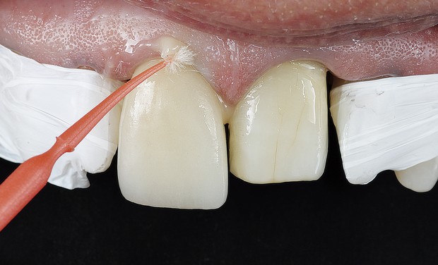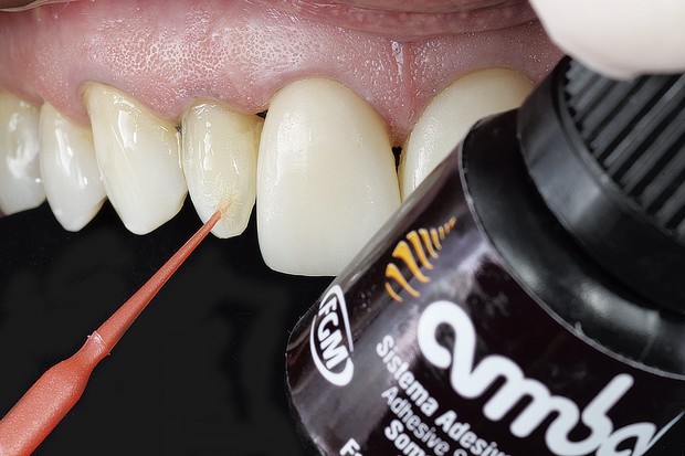 A figura 29 evidencia a aplicação do adesivo monocomponente (Ambar) sobre o esmalte e dentina com um Cavibrush. É importante salientar que o esmalte pode estar seco ou úmido, mas a área de dentina exposta, neste caso a cervical, deve ser previamente reidratada.