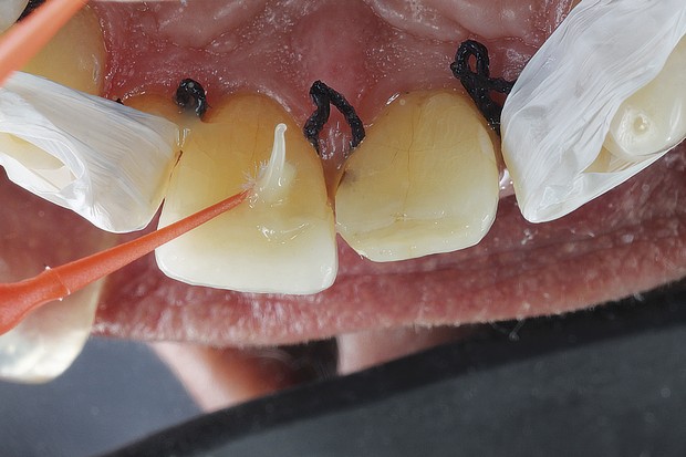 A imagem 28a mostra que o condicionamento do esmalte dental deve ser feito com gel de ácido fosfórico (Condac 37) por 30 segundos. A remoção do ácido deve ser realizada inicialmente com cânula de aspiração (figura 28b) e, finalmente, lavada com jato de água. Note que os dentes vizinhos estão a priori isolados (figura 28c).