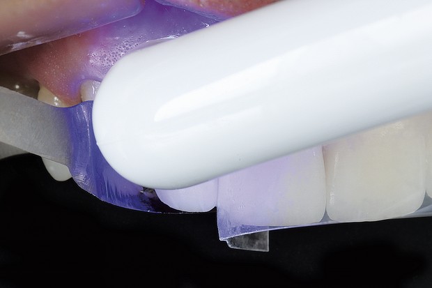 A fotopolimerização após o assentamento dos laminados dos dois incisivos centrais, permitindo o correto assentamento dos dois é demonstrada na figura 36.
