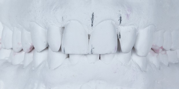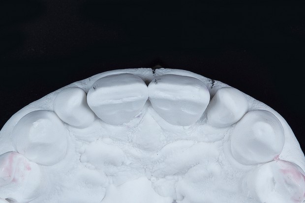 Após moldagem com um material de impressão elastomérico, obtemos o modelo de estudo em gesso. Este modelo de gesso deverá ter a linha sagital mediana traçada para orientar quem for fazer o enceramento de diagnóstico, quer seja o próprio cirurgião-dentista, ou o técnico em prótese dental (TPD). A figura 7a mostra que os modelos devem ser articulados para maior riqueza de informação. Pode ser verificada na figura 7b a discrepância da linha sagital mediana e do ponto de contato entre incisivos centrais, e a giroversão dos incisivos laterais. No modelo, para poder fazer um correto enceramento, alguns desgastes proximais para corrigir os pontos de contato foram feitos, como é possível avaliar na figura 7c.