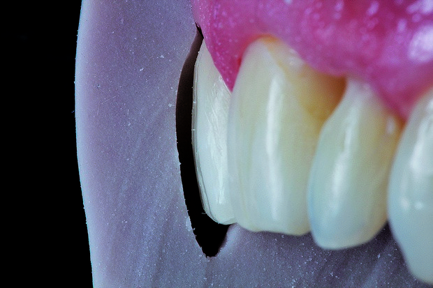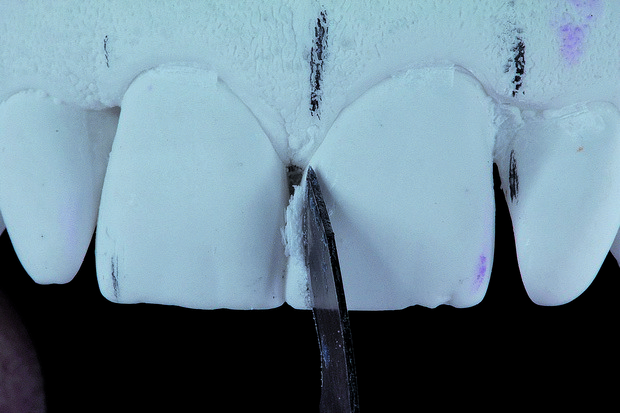 Para a redução vestibular é utilizada uma guia de preparo, que é confeccionada da mesma forma que a guia de mockup, mas o corte não é cervical, e sim de vestibular para palatino, vários cortes, de acordo com o dente que estiver sendo preparado. Note na figura 13 que o incisivo central superior esquerdo não precisou ser preparado, pois o enceramento considerou apenas acrescentar volume vestibular neste dente, seguindo o princípio da mínima invasão.