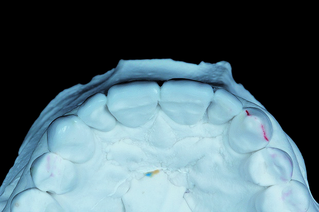 A marcação nos dentes do paciente dos pontos proximais a serem desgastados, baseando-se no desenho digital e no desgaste seletivo no modelo de gesso pode ser observada na figura 9.