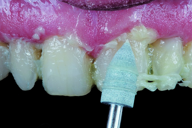 As figuras de 33a a 33c mostram que o excesso de cimento resinoso Allcem Veneer deve ser removido com um Cavibrush, tanto por vestibular, quanto por palatino, evitando excessos e remoção exagerada.