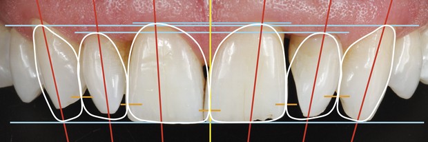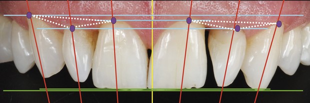 A figura 4 exibe a análise dental, a fotografia intraoral com o traçado das linhas de referências horizontais baseadas na linha interpupilar (linhas azuis: zênites gengivais; linhas verdes: bordas incisais) e verticais baseada na linha glabela/mento (linha amarela). É importante observar que os zênites gengivais dos incisivos centrais e laterais se apresentam no mesmo plano, mas o mesmo não observamos nos caninos, sendo o zênite gengival do direito significativamente mais alto. As linhas verdes indicam uma desarmonia significativa entre os incisivos laterais e principalmente entre os caninos. A linha média facial não se mostra coincidente com o ponto de contato entre os incisivos centrais, mostrando um desvio à direita. Os longos eixos dentários (linhas vermelhas) apresentam-se harmônicos, convergentes para a linha sagital mediana. Os zênites gengivais (pontos roxos) têm contorno ascendente de incisivos centrais para caninos. Traçada uma linha imaginária entre o zênite gengival do incisivo central e o zênite do canino, o zênite do incisivo lateral deve se situar nesta linha ou abaixo da mesma para proporcionar harmonia no sorriso, o que observamos no caso clínico.