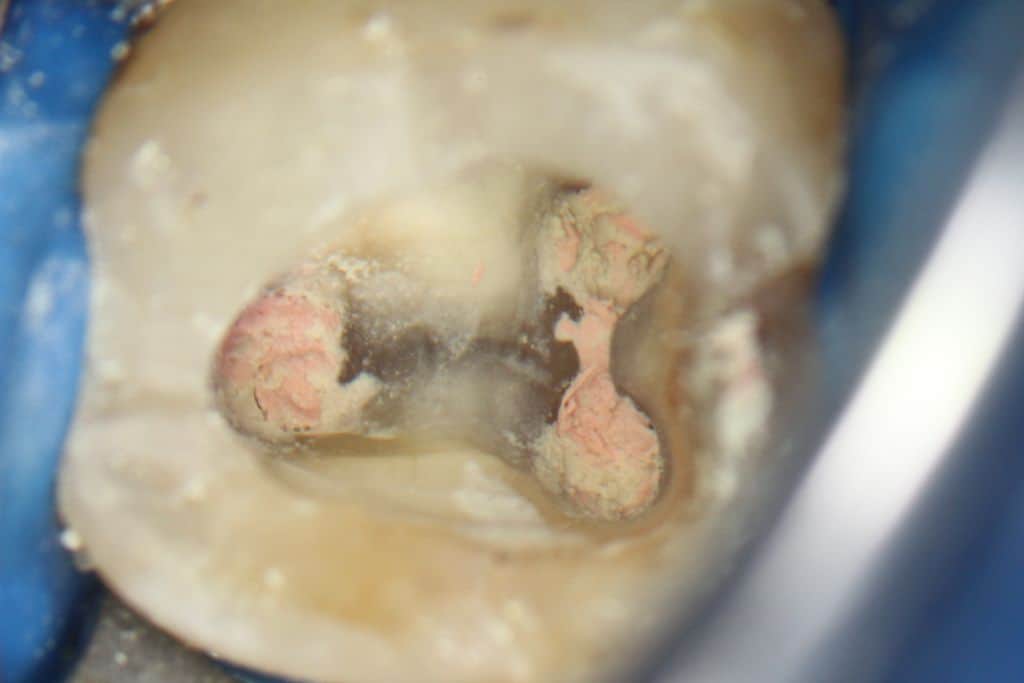 Os passos seguintes foram realizar a odontometria eletrônica com um localizador foraminal e estabelecer o comprimento real de trabalho. No comprimento de trabalho foi verificado o diâmetro da região por meio da introdução de diferentes calibres de limas manuais do tipo K até que observar-se o ajuste de uma delas às paredes laterais dos canais. Nos canais mesiais, o instrumento que se adaptou à essa região foi o #30, e no canal distal o #40. Desta forma, e na mesma sequência operatória inicial de preparo, modelagem e irrigação, os canais mesiais foram preparados até o instrumento Reciproc 40 (VDW), e o canal distal até o instrumento Reciproc 50 (VDW).